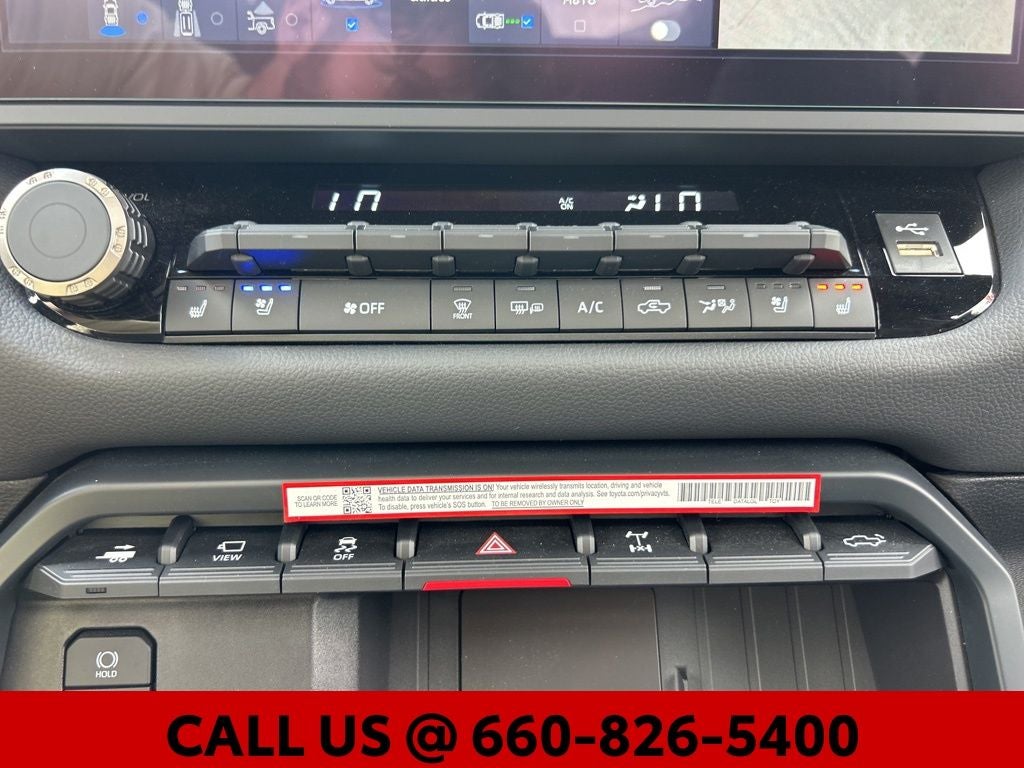 - TRD leather-wrapped manual tilt/telescopic steering wheel with TRD badge, red center stripe, and phone, audio, display/infotainment, and Driver Assist controls