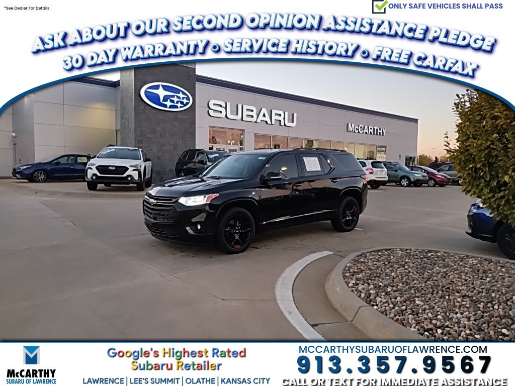Meet the **2021 Chevrolet Traverse Premier** - the three-row SUV that thinks big, drives smooth, and looks sharp doing it. This isn't your average family hauler; it's the perfect balance of strength, sophistication, and smarts. And at **McCarthy Subaru of Lawrence**, you'll **never buy AS-IS again!** Every pre-owned vehicle we offer comes with a **1 Month / 1,000-Mile Limited Warranty**, a **Quality & Safety Inspection**, a **Free Carfax Report**, and our signature ability to **sign and ship anywhere in the United States!**